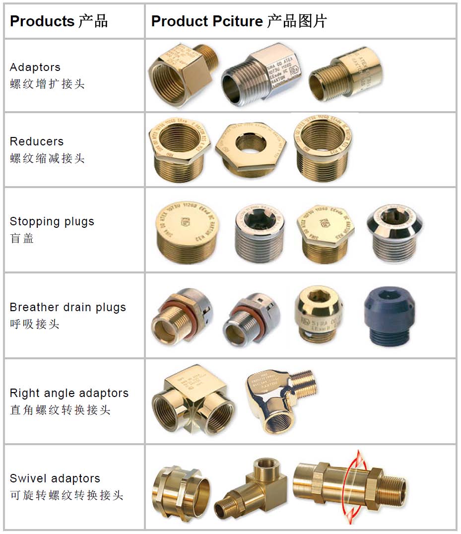主要產(chǎn)品:防爆螺紋轉(zhuǎn)換接頭,如隔爆及增安型螺紋適配器、縮減器、絲堵、呼吸接頭及其它附件如螺母、接地圈、IP密封圈、鋸齒墊圈等。